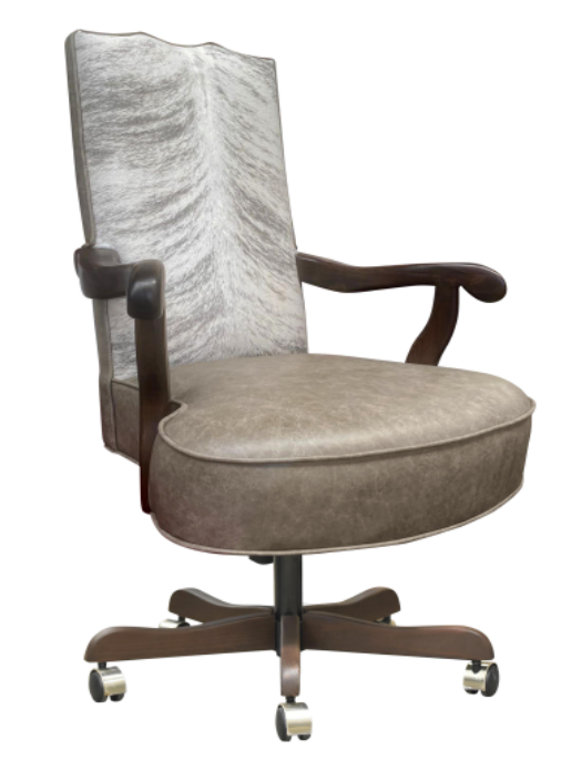 A gorgeous variation of the Ranch Collection Office Chair. This beauty features dark walnut stain, buttery chocolate leather, and gorgeous medium brindle cowhide. These stunning office chairs are made to order with a lead time of 4-6 weeks. The seat height is adjustable from 19" to 23", and can be set to recline or stay stationary all within our hydraulic Leggett & Platt system. The adjustable arm height at the lowest level measures 27" and at the highest level measures 31-1/2". The Ranch Brindle office chair is handcrafted in the USA by LOREC Ranch Home Furnishings.
