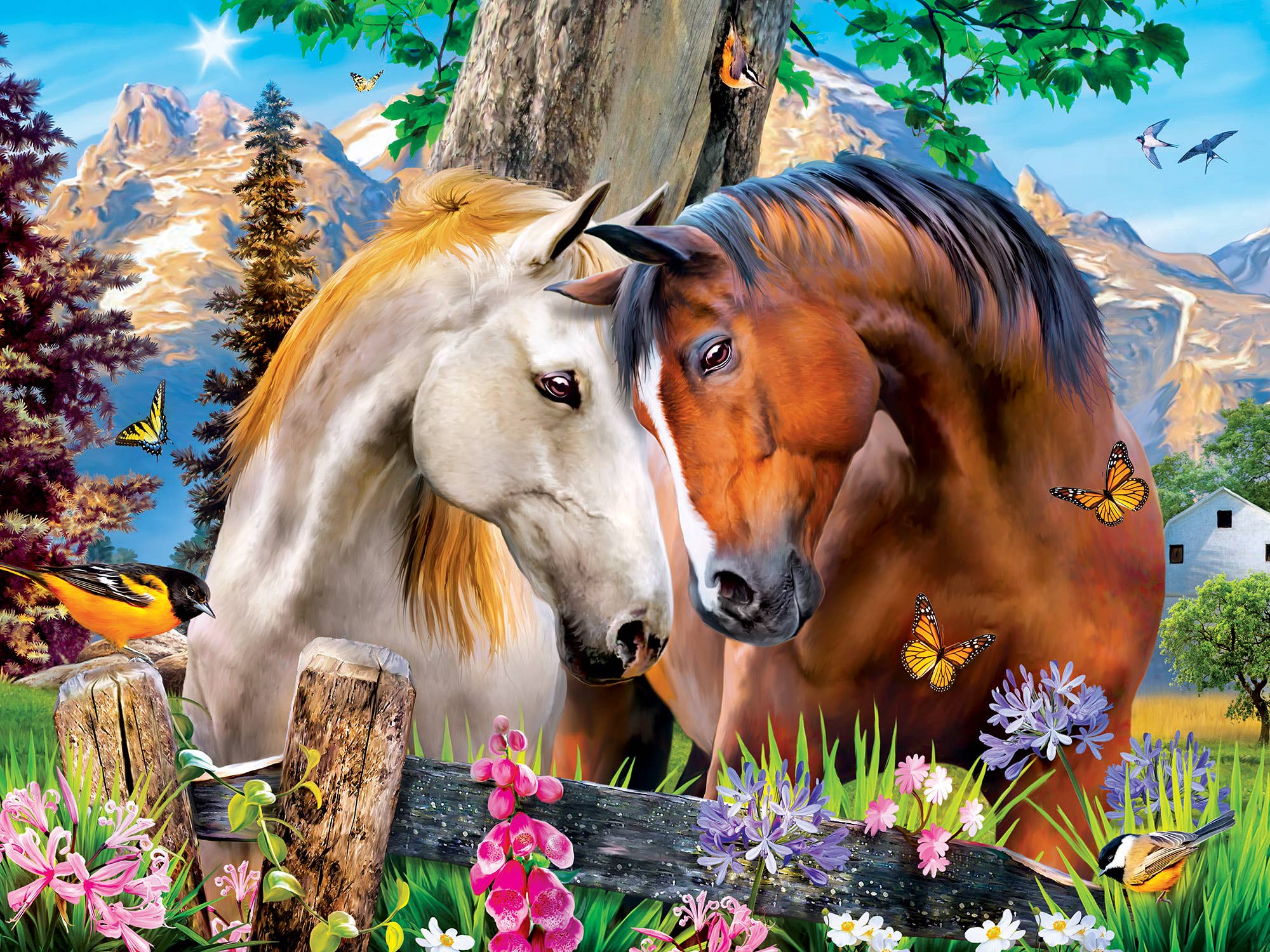 This MasterPieces 18" x 24" 300pc EZ Grip Green Acres Collection features images of farm town favorite animals beautifully hand-painted. Two horses enjoy a beautiful spring day together out in a meadow dotted with wildflowers. Butterflies and songbirds join in the charming scene. Sit back, relax, and enjoy a peaceful afternoon at this mountain farm. Both the packaging and puzzles in this series are made of linen paper. The linen texture matte feel helps prevent glare and makes for an easy to use high-quality puzzling experience. The EZ-Grip die-cut used to make this puzzle offers larger puzzle pieces that snap together perfectly, without compromising image quality. To reduce its impact on our environment, the chipboard used in this puzzle is made of 100% recycled material.