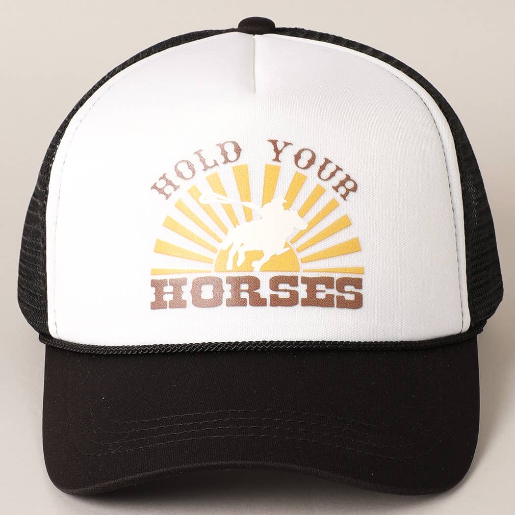 HOLD YOUR HORSES Trucker Hat - HOLD YOUR HORSES Printed Design - 6 Panel Trucker Hat - 100% Polyester - Relaxed Fit and Pre-Curved Visor - Snap Closure *One Size Fits All - Adjustable strap makes fit comfortable*